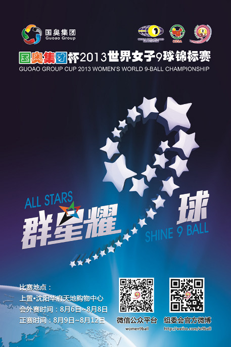 *The 2013 Women’s World 9-ball will be held in Shenyang, China from August 6-12, and is sanctioned by the World Pool & Billiard Association(WPA). 64 women players from across the globe will compete for the biggest prize in Women’s Pool. The 2013 Women’s World 9-ball Championship is a WPA ranking event..