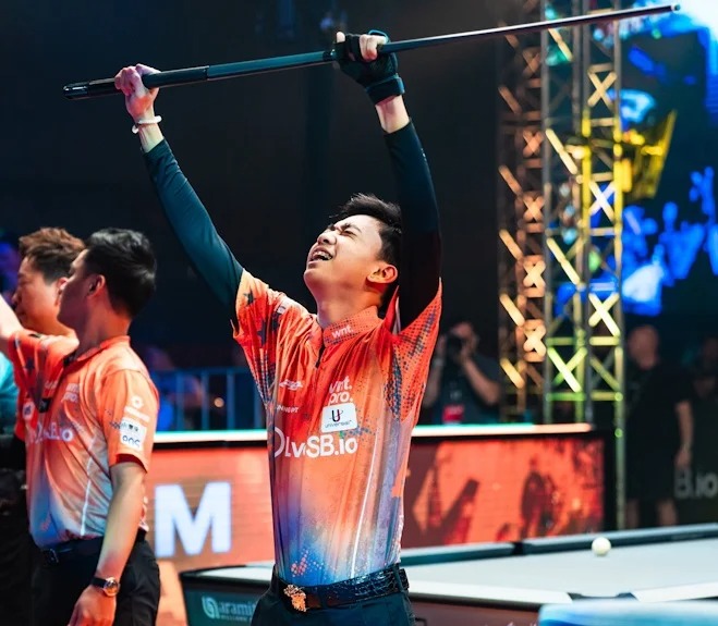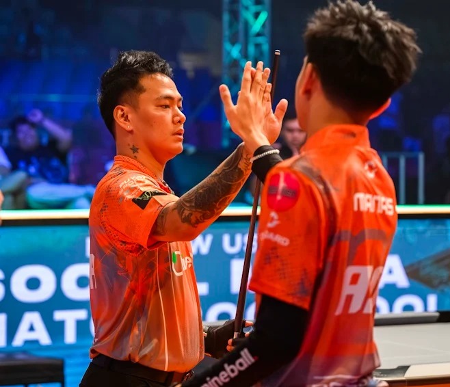 Team Rest of the World started strong with a two-rack lead through Gorst and Shaw, but Duong and Manas hit back quickly to level. Chua’s experience over Neuhausen put Asia ahead, and Biado capitalised on a Gorst miscue to reach the hill. The ROW pair rallied to force hill-hill, but AJ “Starboy” Manas once again delivered under pressure, sinking the decisive nine-ball to clinch the opening point of the day.